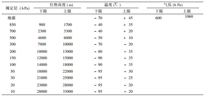 气候极值检查 各标准等压面的高度、温度的气候极值范围见表 1, 露点温度的气候极值范围为-140 ℃~+35 ℃, 风向的范围为0°~360°, 风速的气候极值范围为0~150 m/s, 凡超出气候极值范围的要素值, 都认为是错误记录.