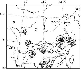 | 图 9. 1992年6月14日00:00 (UTC) 方案E预报的24h降水量分布 (单位:mm ) | |