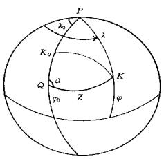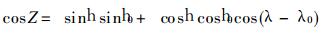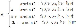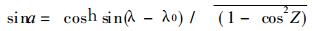 1.1 遮挡点相对于雷达站的方位角如图 1所示, 设Q点为雷达天线所在点, K为任一遮挡点, a为某一遮挡点相对雷达站的方位角, Z为Q到K段弧线所对应的弧度, (λ0, h0) 为雷达站的经纬度, (λ, h) 为遮挡点K的经纬度, 由球面三角公式可以得出[3]: