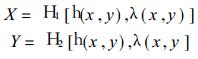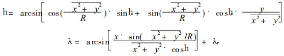 设单站雷达等射束高度图的直角坐标表示为 (x, y), 对应的地理坐标表示为 (h, V), 底图坐标表示为 (X, Y), 其中X=H1 (h, λ), Y=H2 (h, λ), H1、H2为转换函数, 投影方式一经确定, H1和H2即可得出.令h=h (x, y), λ=λ (x, y).故整个坐标变换过程可简单地表示为:
