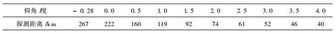 表 1列出了天线架高为100 m时雷达看到3 km高目标物的最大探测距离与天线仰角的关系, 从表中可看出随着仰角的增大, 最大探测距离越来越小.