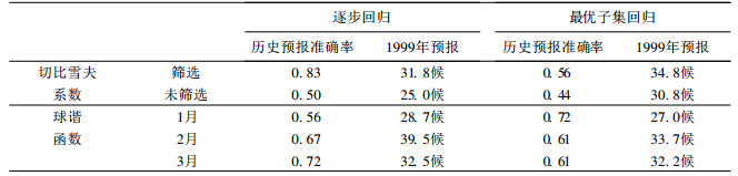 2 预报方法及效果检验我们用逐步回归及最优子集回归 (即双评分回归) 方法进行预测及检验.将上述的切比雪夫系数因子分成2组:一组是 (11×4×6) 284个切比雪夫系数与预报对象 (夏旱结束期) 进行近30年的相关计算, 选出超过0.05置信度的20多个因子作为“筛选因子”, 另一组是10个环流区高度距平及副高强度的66个切比雪夫系数, 作为“未筛选因子”从1951~1999年按n=30的长度进行滑动回归预报, 将1981~1998年 (18年) 的预报值与实际值进行准确性检验:预报值与实际距平相同或误差小于0.5个均方差 (即2.2候) 时, 算作正确.表 1给出了2组因子在不同回归方法中的历史 (18年) 预报准确率; 从中看到“筛选因子”逐步回归方法的预报准确率最高, 达83%, 而这18年中实际值的距平小于0.5个均方差的年份仅占28% (5/18), 即70%以上的年份夏旱结束期明显偏离平均日期, 可见此类方法有明显预报技巧.同时, 我们还用500 hPa月高度距平的球谐函数 (66个) 因子进行类似的滑动回归检验, 其历史预报准确率亦低于“筛选因子”逐步回归方法.回归模式中, 逐步回归效果优于最优子集回归.
