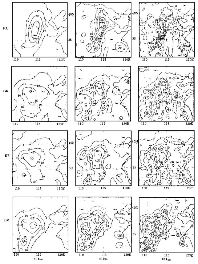 (3) 降水强度的模拟对水平分辨率的改变及不同对流参数化方案的选择有较大的依赖性.总的来说, 模拟的降水中心值随水平分辨率的提高而增大, 这一规律与模式在中α尺度范围 (格距为200~50 km) 时降水强度对水平分辨率的依赖关系是一致的[11].对同一分辨率而言, GR与KF方案模拟的降水强度比较接近, 而KU模拟的降水中心值总是明显地大于其它3种方案.对于这次暴雨过程的主要降水中心 (石家庄附近), 所有方案模拟的雨量都小于实际的降水强度, 但随分辨率的提高, 模拟值越接近实况.对于新乡附近的降水中心, 除20 km的KF方案模拟的强度与实况较为吻合外, 多数模拟结果都较实况有明显的夸大.特别要注意的是, 使用KU方案与BM方案, 尤其当分辨率为10 km时, 模拟的该降水强度都远远超过石家庄附近主要降水中心的强度 (表 1), 其模拟结果的合理性与可靠性是值得进一步推敲的, 至少是缺乏代表性的.