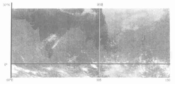 | 图 1. 从0°~30°N, 60°~130°E区域的等经纬度投影图, 拼缝在105°E | |