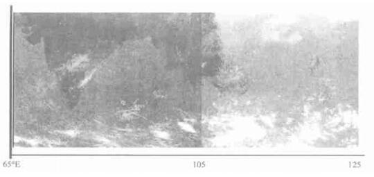 3 拼图及结果分析FY-2A红外通道的有效观域为60°~140°E, GMS-5红外A通道有效观域为100°E~180°.以相对定标结果为基础完成如下拼图, 可以获得有效观域为60°E~180°的大拼图.拼接位置在105°E.双星拼接后观测视野明显加大了, 有利于观察天气系统的移动演变.以相对定标为基础进行图像拼接时没有明显的拼缝, 比简单地应用图像处理手段进行的拼缝平滑具有更强的物理背景.一般风云气象卫星 (FY-2) 的观测时间为正点, GMS的观测时间为半点, 两颗星只在中午加密的测风观测时段才能获取到几乎同时开始的观测资料, 而在其他时段, 两颗星各自的观测时间间隔均为1 h.若将两颗星的资料融合在一起, 实际上资料的时间间隔已经达到0.5 h, 但两颗星仪器特征差异所决定的定标结果的差异, 使得我们很难直接将两颗星的资料融在一个时间序列中, 进行定量应用.此时, 以相对定标为基础, 建立两颗星辐射测值之间的相互关系, 相当于将两颗星的资料进行了归一化, 得到可定量应用的每0.5 h一次的遥感资料时间序列, 这些资料对强对流天气系统发生发展演变过程的定量监测十分有利.下面是以相对定标为基础所做的拼接试验.