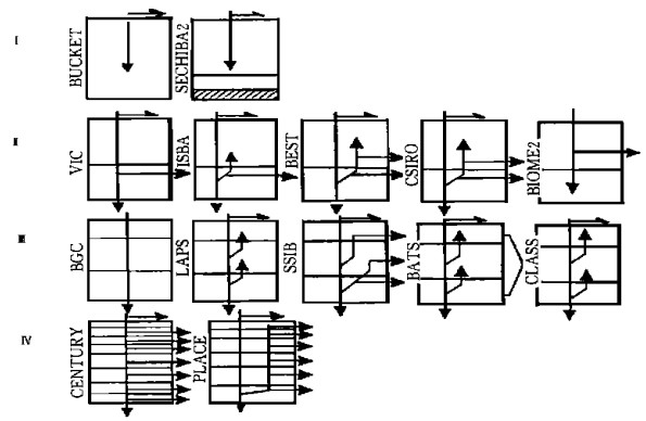 | 图 1. 参与PILPS第2 (b) 阶段陆面模式的径流和排水概念示意图 (其中Ⅰ组为一层土壤、Ⅱ为两层土壤、Ⅲ为三层土壤、Ⅳ为多层土壤, 引自文献[15]) | |