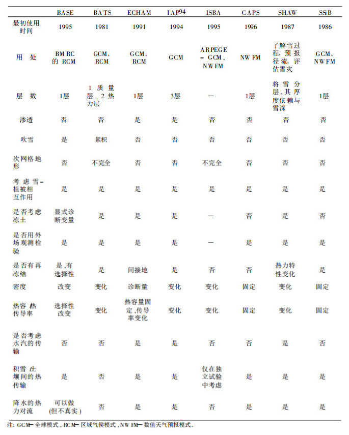 由于研究目的不同 (如用于大气模式、业务径流预报、气候监测、冻土研究等), 不同的雪模式侧重考虑的过程不尽相同, 并且对同一过程, 不同模式的描述也存在差异.许多学者都对它们的异同点进行过总结, Yang (1998) 曾比较全面地从不同的角度比较了40多个雪模式, 表 3是部分比较结果.目前还不清楚全球气候模式中描述雪物理过程所需的最适宜复杂程度, 以及计算雪过程所需要的准确程度 (如水汽扩散和液体水运动).但正如Dickinson等所指出的, 如果不区分雪表温度和表层土壤温度, 在雪融化或降水时会产生严重的概念错误.因此一般认为:雪模式应该分开考虑雪面温度和土壤温度, 而且还应该尽可能地以简单的形式表达尽可能多的雪内部过程信息 (如考虑雪的存留作用、压实和融化过程等造成的变形过程、雪内的水分热量传输、反照率的变化等, 私人通信).要发展模拟效果好、计算效率高的雪模式还有待于进一步研究.