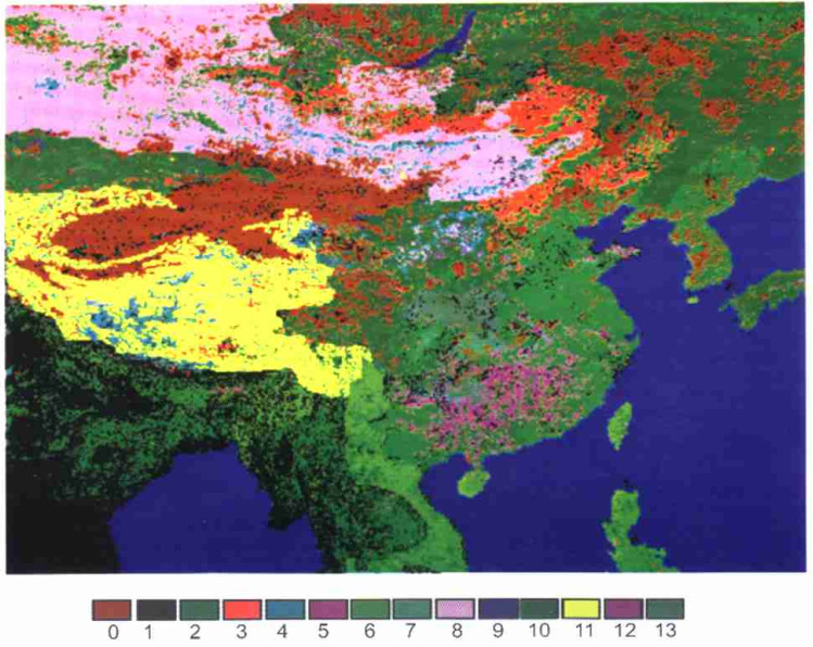 | 图 1. 卫星遥感地表植被分布 (1997~1998年, 图标:0戈壁, 沙漠, 1无类别, 卫星资料缺, 2农耕区。3北方草甸草原, 4永久冻土, 5亚热带常绿灌木, 6热带雨林, 7阔叶林, 8大草原, 9水体, 10针叶林, 11高寒荒漠, 12沙地, 13针阔混交林) | |