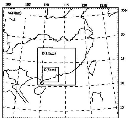 模式网格用3层套网格, 最外层A格距45 km, 水平格点数61×61;第2层B格距15 km, 水平格点数61×61;最内层C格距5 km, 水平格点数73×73。网格中心点最外层取在114°E, 25°N; 第2层113.1°E, 24.2°N, 最内层111.9°E, 22.5°N (见图 2)。