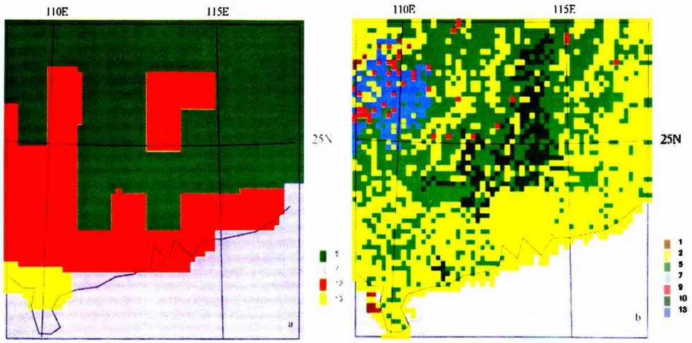 | 图 3. 中网络B内地表植被分布 (a) NCAR地表植被资料 (5针叶林, 7水体, 12热带或亚热带森林, 13热带或亚热带草原) (b) NSMC地表植被资料 (1沙地, 2农耕区, 5亚热带常绿灌木, 7水体, 9阔叶林, 10针叶林, 13针阔混交林) | |