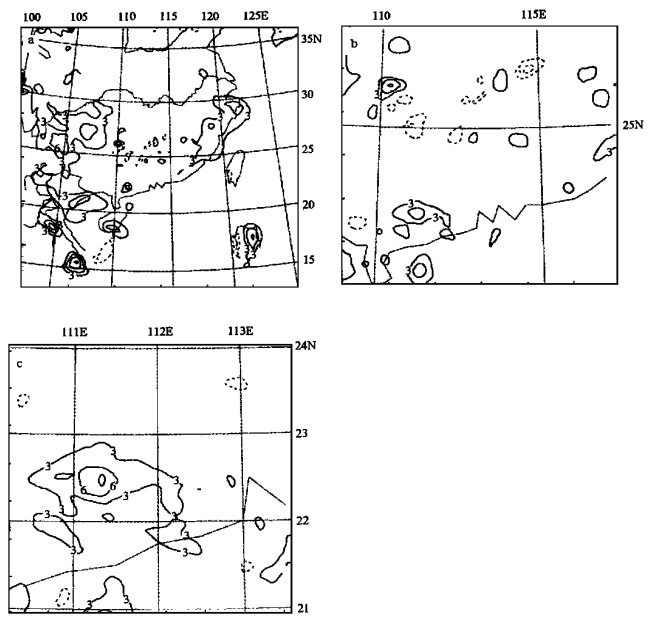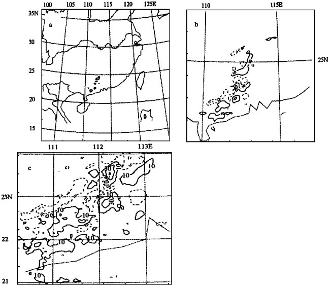 | 图 4. NSMC和NCAR地表植被资料用于MM5模式模拟24 h降水量之差 (a) 网格A (格距45 km) (b) 网格B (格距15 km) (c) 网格C (格距5 km) (等值线单位:mm, 实线代表正差, 虚线代表负差) | |