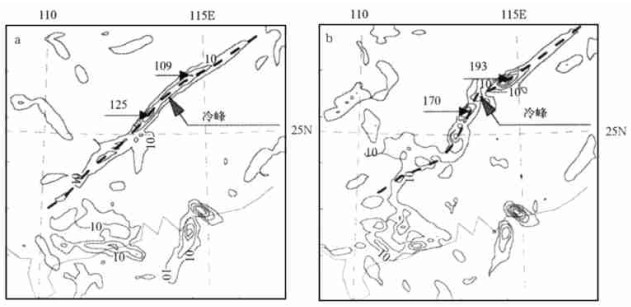 用二种地表植被资料EXP3A、3B模拟预报的23日20:00 (积分12 h) 的锋生函数比较, 对格距45 km的粗网格, 结果差别不大。对格距15 km的中网格, 用NSMC资料的锋生强度比NCAR资料的强。图 5为格距15 km下分别用NCAR和NSMC资料预报的950 hPa等压面上锋生函数。在沿冷锋走向的狭长的锋生带上有一些中尺度的大值区, 地表植被资料对这些大值具有明显的反映:用NCAR资料模拟的大值为125×10-10K·s-1·m-1和109×10-10K·s-1·m-1; 在同样位置上用NSMC资料模拟的数值分别为179 ×10-10K·s-1·m-1和193×10-10K·s-1·m-1, 后者比前者高36%和77%。