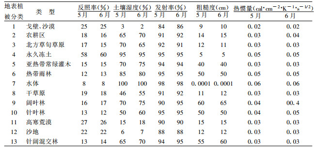 PSU/NCAR中尺度模式MM5中的地表植被资料将地表植被分成13类, 尽管其空间分辨率已细到10′, 但因其分类考虑重点为北美的全球植被分布, 因而对美国国土以外的某局部地区来说, 其分类就显得很粗, 这将在图 3中给以说明, 各类地表特征所对应的物理参数也只是区分了夏、冬二季节的气候平均 (表 1) [10]。