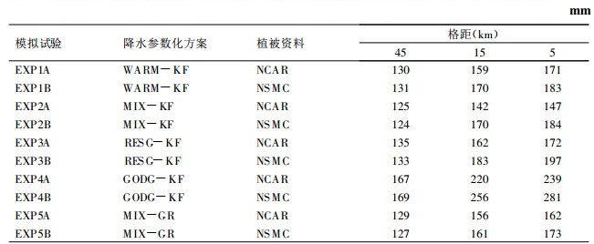 表 3给出了在5种降水参数化方案试验中分别用NCAR资料和NSMC资料模拟试验所得的最大降水中心雨量比较。表中WARM表示不考虑冰相的暖云方案; MIX表示Reisner混合冰相方案; RESG表示Reisner霰方案; GODG表示Goddard霰方案; KF表示Kain-Fritsch次网格尺度积云对流参数化方案; GR表示Grell次网格尺度积云对流参数化方案。