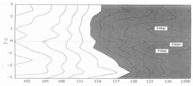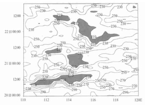 | 图 1. 1998年7日20~22日TBB沿30°N的时间-经度剖面图 (阴影区为TBB小于210 K, 等值线间隔:20 K) | |