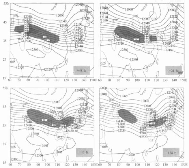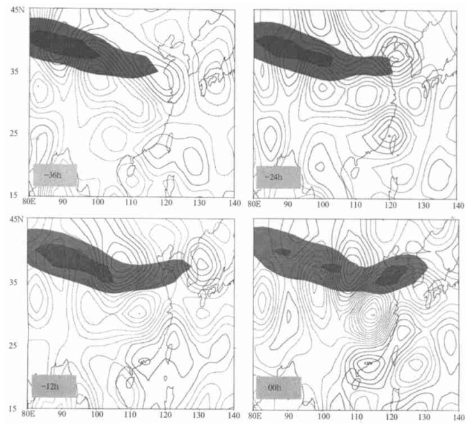 | 图 3. 长江中游大暴雨发生前后200 hPa高度场和急流轴的演变特征 (实线为等高线 (间隔为40 gpm); 浅阴影区为风速≥35 m/s; 深阴影区为风速≥40 m/s; 虚线为500 hPa上较强的上升、下沉运动区 (ω≤-0.10 Pa/s或ω≥0.05 Pa/s; 间隔:0.05)) | |