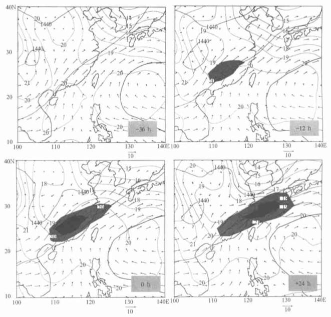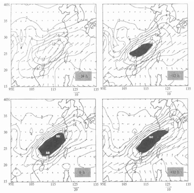 当长江中游大暴雨发生时 (0 h), 东南沿海上空的SW气流进一步增强, 风速最大值已超过了12 m/s, 达到了低空急流的强度, 而此时暴雨区则刚好位于该低空急流的左前方。由前一小节的分析可知, 该低空SW气流的增强显然是与暴雨凝结潜热的释放增强了暴雨区南侧的垂直反环流有关, 而低空SW急流的增强又通过向暴雨区输送水汽使暴雨得以维持。当暴雨发生以后, 低空SW急流渐渐向东北方向移动, 至+24 h时, 低空急流中心已移到了浙江省以东的太平洋上。