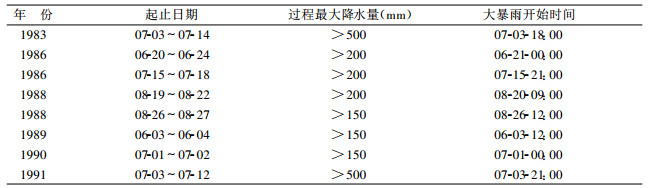 1 大暴雨过程的选取和暴雨开始时间的确定本文采用的主要资料包括:(1) 美国NCAR/NCEP提供的1980~1994年每日两次 (00:00UTC, 12:00UTC (下同)) 的再分析资料, 空间分辨率为2.5°×2.5°; (2) 日本气象研究所提供的1980~1994年每日8次观测的GMS黑体辐射温度 (TBB) 资料, 其空间分辨率为1.0°×1.0°。
