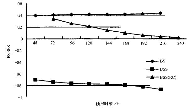 (4) 通过降水概率预报的BS 、BSS 、命中率和空报率的统计检验,目前的国家气象中心的降水预报还未达到作为业务参考的水平,且远比EC 为差。