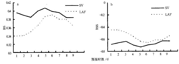 而图 3 是对2000 年9~10 月23 个样本的降水大于1 mm 的SV 和LAF 法的概率预报BS 和BSS 检验比较,它表明了在10 d 内LAF 法的集合预报降水优于SV 法的集合预报降水。