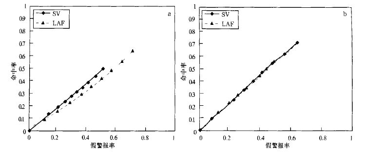 图 4 就是2000 年9~10 月利用LAF 和SV 法制作的T106L19 谱模式对降水大于1 mm的预报时效12~36 h 及108~132 h 的23 个例子的平均ROC 曲线的比较。它表明了事件预报的命中率和假警报率的相对比较的关系。如ROC 曲线越靠近图的左上方,命中率高而假警报率低,预报越好;反之亦然。由图可见,SV 法在短期降水集合平均预报与LAF 法差不多,而在中期第5 天的降水集合预报比LAF 法好,但它们的ROC 面积均小于0.5,它们的预报已成为无技巧了,不能分辨出事件的发生与否。
