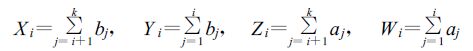 其中k =10,Xi 为水平虚线下出现次数的总和,Yi 为水平虚线以上出现次数的总和,Zi为水平虚线下未出现次数的总和,Wi 为水平虚线以上未出现次数的总和。Xi +Yi 为表中右列所有次数的总和,在表的下边给出;Zi +Wi 是表中左列所有次数的总和。在i =3情况下,利用式(8)和式(9)可求出命中率f =0.37,假警报率g =0.54。