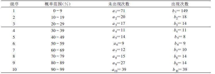 在每个格点上,将预报概率分层为以10 %为宽度的纵向概率层次,对每个宽度统计事件发生和不发生的次数,制作出表 3。