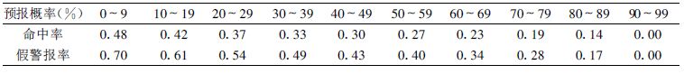 通过在表上“移动水平虚线”可得不同的概率临界值,从而可计算得到其他的命中率和假警报率数据,如表 4 所示。