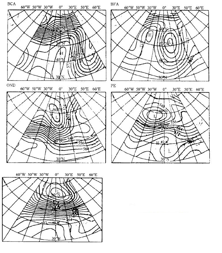 法国气象局在通过大量的天气学分析的基础上提出了超天气尺度(波数小于20)的概念,并将天气类型定义为持续时间为两天以上且变化很小的大尺度环流。因此一个具体的天气形势或对应于某一选定的天气类型,或几个天气类型的叠加并与地理位置和季节有关。本文对ECMWF 的51 个集合预报成员进行划分,用到的变量是500 hPa 高度场,也可使用850 hPa 温度场或平均海平面气压。图 1 给出了由法国中期预报员根据长期预报经验定义的影响法国的5 类天气类型。
