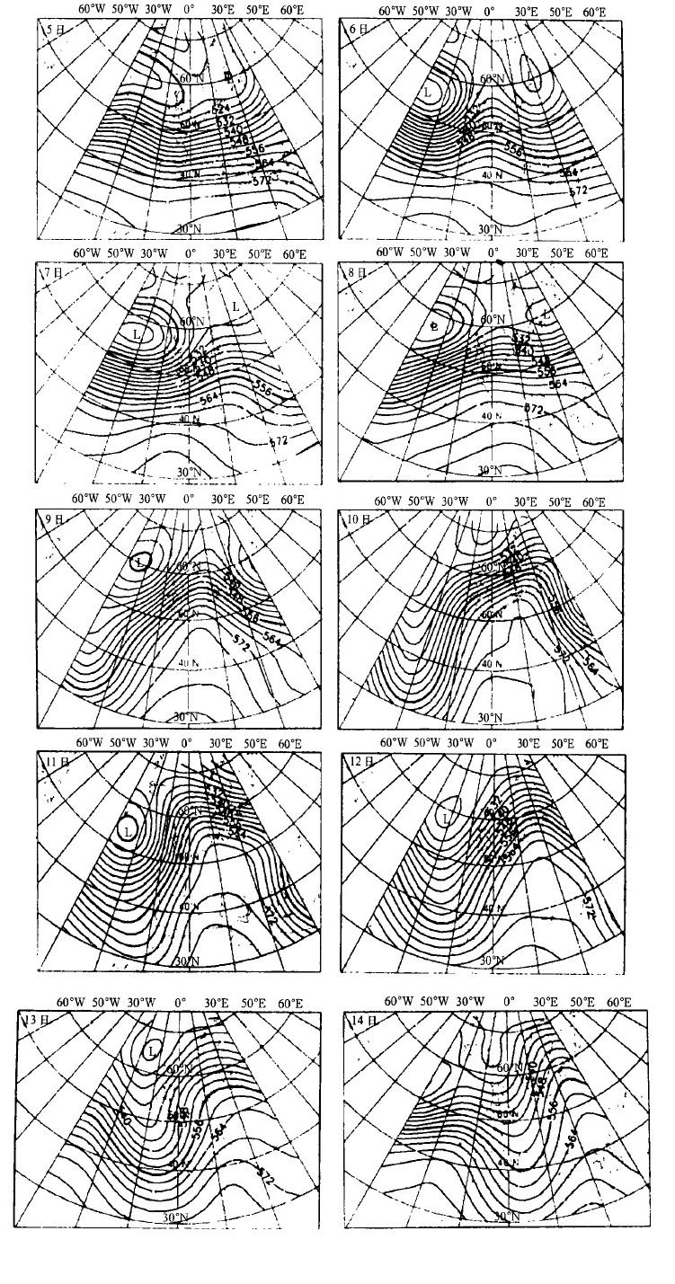 图 2. 1998 年1 月4 日起报的5~14 日12:00UTC 500 hPa 的分析场