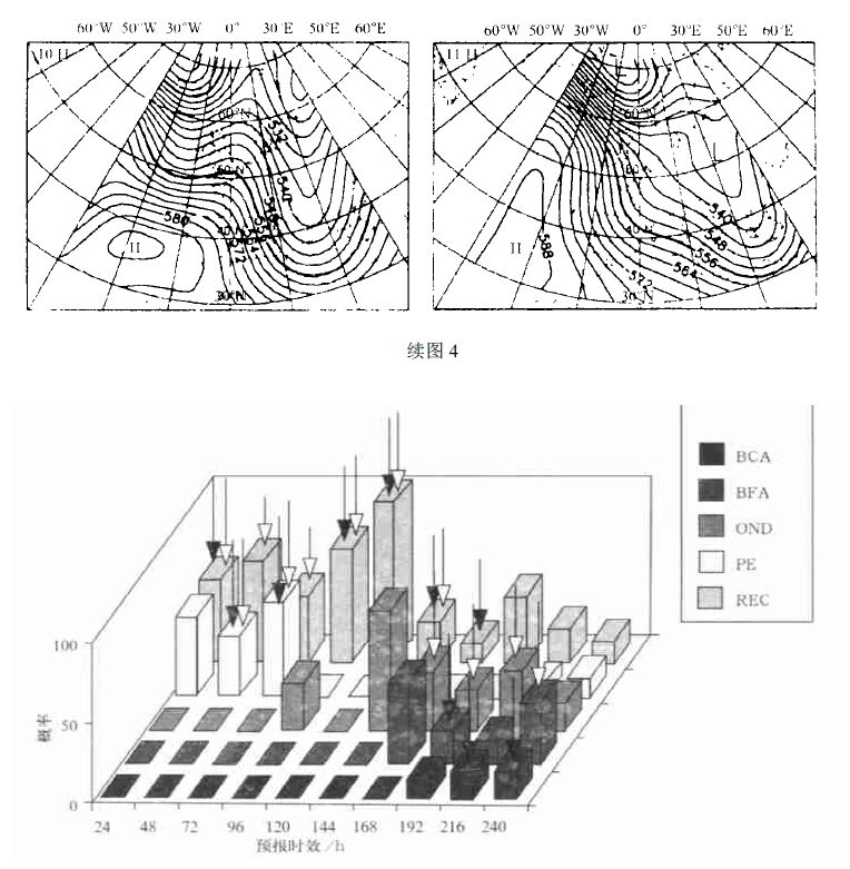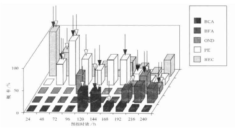 3.1 1998 年1 月4 日个例图 2 给出了对应于1 月4 日起报的相应10 天预报的分析场。可以看出在这10 天的时间里,经历了4 种天气形势的演变(REC,PE,BCA 和OND),其中天气类型从1 月8 日的REC 转换为1 月9 日的BCA,从1 月11 日的BCA 演变为1 月12 日的OND。图 3 给出了划分的结果,其中黑箭头表示根据自动划分方法得到的结果,白箭头表示主观划分的结果。黑箭头与白箭头均有表示划分是正确的,横坐标表示预报时效(24~240 h),垂直坐标表示各种不同天气类型发生的概率。另外还可看出,对同一时效,有时有两个主观划分,其意义为这一天的天气为两个类型的叠加。