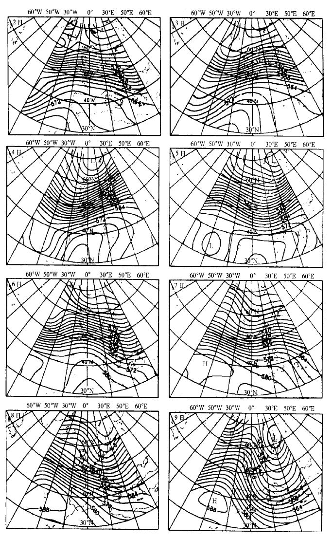 图 4. 1998 年3 月1 日起报的3 月2~11 日12:00UTC 500 hPa 的分析场