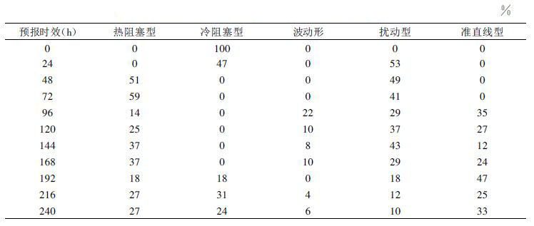 3.3 自动划分结果在业务中的体现及应用表 1 给出了1998 年12 月6 日用该方法对ECMWF 集合预报产品在法国的天气划分结果。其中在时效栏中“0”表示对当天分析的划分即前一天的天气类型;与各种天气类型和时效相对应的是该类天气形势在这一天的发生概率。可以看出,该方法将500 hPa 高度场的51 个成员、10 天的预报共510 张图浓缩到一张表格上,预报员根据此表格可很方便地得出在某一天可能影响法国的天气类型,及每种天气类型可能发生的概率(%),从而结合其积累的经验和其它预报产品制作出天气预报,大大拓宽了预报员的预报思路。如120 h 的预报可能发生4 种天气形势,其中热阻型发生的概率为25 %,波动型发生的概率为10 %,扰动型发生的概率为37 %,准直线型发生的概率为27 %。