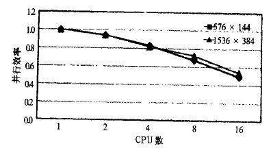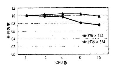 从表 4、表 5 和图 3、图 4 中可以看出,当计算量达到一定大小时,并行效率能大于1,也就是出现了所谓的超线性现象(superlinear)。这是由于计算机存在多层存储体系造成的。当计算量较大时,数据在外存、内存、缓存和寄存器之间移入移出,需要花费时间。多个CPU 并行执行时,每个CPU 的计算量减小,数据移动时间减小,若其减小程度比花在结点间的通讯时间要大,就会出现超线性现象。当参与计算的CPU 数足够多,数据移动时间可忽略不计时,由于结点间的通讯开销增大,并行效率下降。但总的来说,仍是计算量越大,并行效果越好。