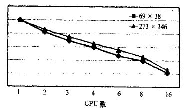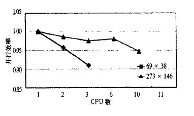 从表 2、表 3 和图 1、图 2 可以看出,随着计算格点量的增大,加速比和并行效率明显提高。这是存在相对并行开销的原因。这种并行开销的时间要花在产生子进程、开始和结束并行区,在并行区结束时进行同步以及为并行化所加的额外代码的执行等方面。当计算格点量增大时,这种开销所花费的时间相对于自身计算所花费的时间越来越小,因而加速比和并行效率就会明显提高。鉴此,我们在用这种方式并行化串行程序时,就应该尽量并行化那些计算量较大的循环,在加指导语句时可以配合使用条件判断语句来选择并行计算量合适的循环。另外,要根据实际程序所需而指定参加计算的CPU 数。过分地要求增加参加并行运算的CPU 数,计算效率下降,反而造成资源浪费。如对YH 模式来说,用6 个CPU 进行计算就行了。