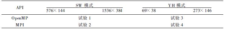 分别测试了两个模式的两种计算格点量,即对SW 模式水平格点数(I × J)为576 ×144 和1536 ×384,YH 模式则为69 ×38 和273 ×146。