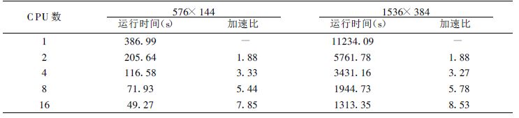 从编程角度考虑,OpenMP 明显地比MPI 容易被接受,开发并行模式的时间较短,也很灵活,在不存在数据相关的情况下,OpenMP 的并行可以从水平或垂直方向进行,而对于MPI 来说,由于垂直方向上的数据相关性太强,因此并行区域的划分适于在水平方向上进行。从并行粒度上来说,OpenMP 着重于循环级、过程级的开发,MPI 则是更粗粒度的程序级并行,因而后者更易获得较高的并行效率。从试验结果中也可看出,OpenMP 版本的并行模式效率明显低于MPI。另外,当CPU 数比较多时,OpenMP 所提供的性能远不如MPI。