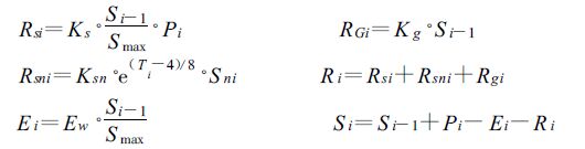 式中Rsi、Rgi和Rsni分别为地面、地下和融雪径流;Si、Si -1为本月和上月土壤蓄水量;Pi、 E i 和R i 为月降水量、蒸散发量和计算径流量;Ew 为月蒸发能力,常以E601 蒸发皿观测值代替或根据气象资料计算;Sni为月积雪量,可根据月降水量和气温线性估算[9];Ti 为月平均气温;Smax为最大土壤蓄水量,Ks 为地面径流折算系数,Kg 为地下径流系数,Ksn 为融雪径流系数。
