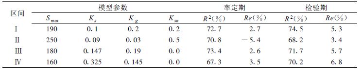 土壤含水量Si 是表征流域状态的中间变量,在模型运行中,先给出其初始值S0 ,再计算3 种水源,然后根据水量平衡原理依次迭代本时段和下一时段状态值Si 和Si+1;一般取最大土壤含水量的一半作为初始值S0 ,为消除这种人为因素的影响,可取系列的前两年作为预热期,用后面的资料来率定参数,为检验模型对流域的适应性,一般还要预留3~5 年资料进行模型检验,只有在率定期和检验期模拟精度都满足要求的情况下,才认为模型合格。