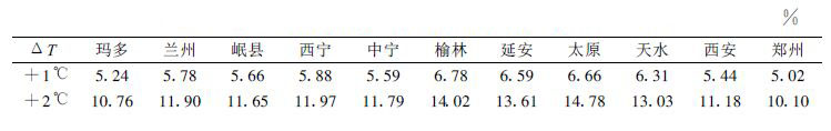 由表可以看出:在气温升高1 ℃和2 ℃的情况下,上中游蒸发能力分别增加5 %~7 %和10 %~15 %;在地域分布上,中游榆林、延安、太原和天水站的变化幅度较大,分别为6.3 %~6.8 %和13 %~15 %;其余各站增加幅度较小,分别在5.5 %和11 %左右。