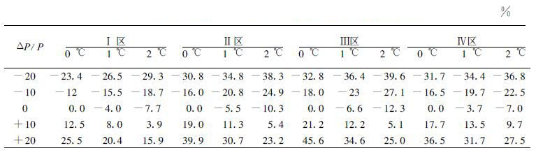由表可以看出:(1)径流随降水的增加而增大,随气温的升高而减小;(2)径流对降水变化的响应较对气温变化的响应更为显著;当气温保持不变,降水增加10 %时,4 个区间的径流量将增加12 %~22 %;而当降水不变,气温升高1 ℃时,径流量将减少3 %~7 %;(3)气温对径流的影响随降水的增加而更为明显;随降水减少,气温对径流的影响不明显;(4)4 个区域中,中游Ⅱ区和Ⅲ区对气候变化较为敏感,而Ⅰ 区对气候变化的响应相对较弱;究其原因,主要由于上游较中游更为湿润且具有显著的融雪径流所致。(5)在15 种假定的气候情景中,最为不利的情景是气温升高2 ℃,同时降水减少20 %,在这种情况下,径流量将减少30 %~40 %。