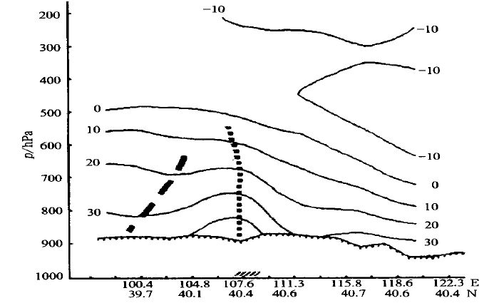 (单位:104 J·hPa-1·m-2;点线:高能轴线;虚线:低能轴线;斜线阴影区为临河市所在地) |