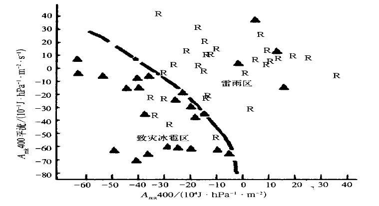 (1) 有21 例致灾冰雹日(占总数的84%)落在区界的左下方致灾冰雹区内;(2)有24 例雷雨日(占总日数的83 %)落在雷雨区内;(3)致灾冰雹在点聚图上的集中,说明中高层湿-比有效能量及平流与雹云的发生发展有密切的关系,是区分雷雨日和致灾冰雹日的重要判据之一。若中高层湿-比有效能量值及其平流值小时,则有利于出现致灾冰雹;当这两个物理量大时,有利于出现雷雨。