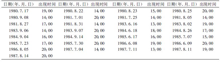 表 1 1980~1987 年6~9 月29 例雷雨日日期及出现时间(北京时) |