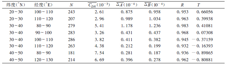 为了说明式(12)对非均匀性分布对网格点的总体订正特征,表 2 给出了中国地区各区域中性曳力系数及其计算误差对比分析数据。表中N 为给定经纬度范围内的60 km×60 km 网格点在中国区域的点数,CDN 为由网格元平均粗糙度直接计算的中性曳力系数,ΔA 为实际中性曳力系数(由10 km×10 km 网格点的数据求得)与CDN 的差,ΔB 为由式(15)得到的中性曳力系数订正值,R 表示为同一区域中ΔA 与ΔB 的相关系数,T 为t 检验的统计量。上画线表示区域平均值。