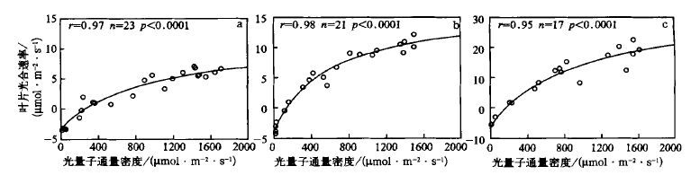 式中α,Pmax分别是初始量子效率和最大光合速率;利用最小二乘法原理拟合光合作用的光响应曲线,即通过迭代使拟合残差平方和δ达到最小。