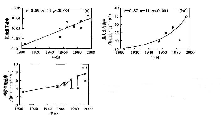 (3) 目前各学科广泛交叉,植被作为重要的地球表层生态因子,已经开始与地球生物化学模型相耦合[21-26],并且正在试图与大气模式相耦合[30]。本文所得到的大量参数,为未来建立综合模式提供了最基本的模型参数。此外,本文首次揭示了叶片光合作用的演变过程,由此可以断定作物生产潜力也必然存在一种演变过程,因此,在本文研究基础上,有可能进一步揭示中国近代作物生产力的演变过程及未来演变趋势。作为人口大国,这一研究将对中国的粮食安全提供重要理论依据。此外,气候变化对农业影响成为目前国内外研究热门课题,在研究中对未来生产力进行预测时,一般假定目前作物特性保持不变,模拟未来几十年后的气候情景下生产力变化状况。然而,本文清楚地揭示出,自1949年到目前20世纪90年代,随着品种的进化,叶片光合能力已经得到大幅度提高,而且品种进化已使叶片光合能力提高了不止一倍。因此,在以后有关气候变化对作物生产力影响的研究中应当进一步考虑品种进化的影响。本文提供的大量基础数据,为设计品种进化情景提供了重要的科学依据。