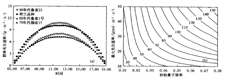 | 图 4. 品种特征参数对冬小麦群体光合的影响 (a) 不同品种群体光合日变化过程;(b) 特征参数对光合日总量影响的数值分析 (图中等值线单位:g·m -2·d -1) | |