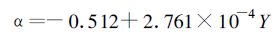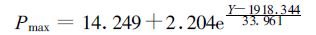 式中Y为年份。由式 (1) 和式 (2) 可以看出,单纯从数学公式上也可以发现α和Pmax是决定光合作用曲线的最主要的两个参数,Rd并不能改变光响应曲线的形式而仅能改变曲线在坐标系中的上下位移,并且R d是一个较小量 (表 1),对整个曲线的影响相对α和Pmax而言要小得多。从整体趋势来看,作为影响光响应曲线的最主要的两个特征参数,α和Pmax在1949年以来有了较大幅度的提高,这也是黄淮海地区作物生产力逐步提高的最直接的根本原因。