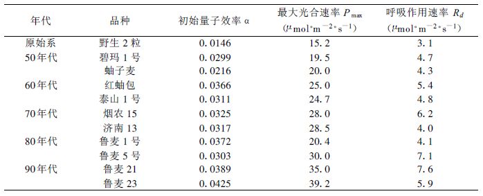 将实测数据代入式 (1)、(2) 进行迭代运算,得到冬小麦光合作用曲线 (图 1)。对全部品种分别确定各自的光响应曲线,即可得到不同年代冬小麦叶片光合作用特征参数 (表 1)。